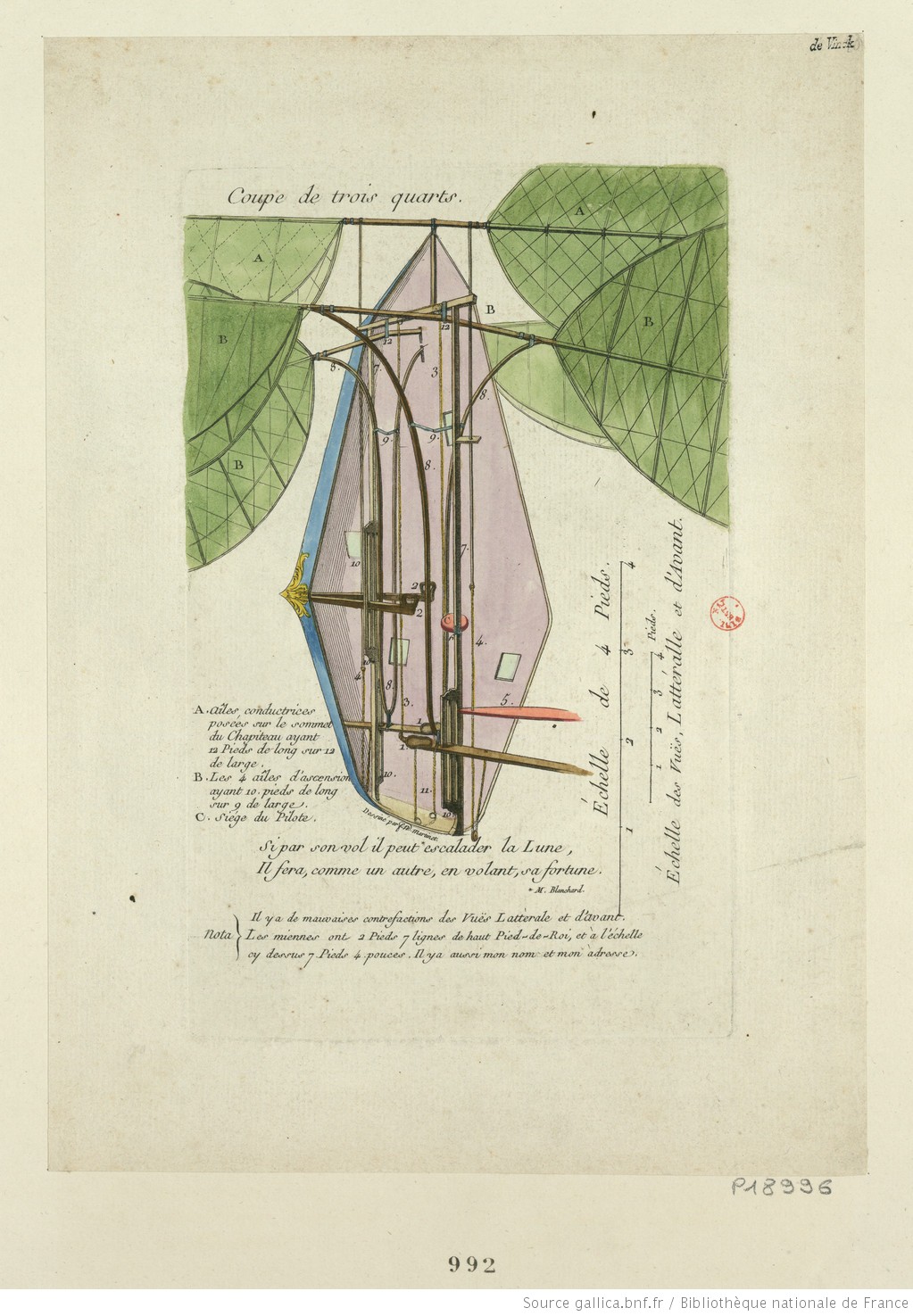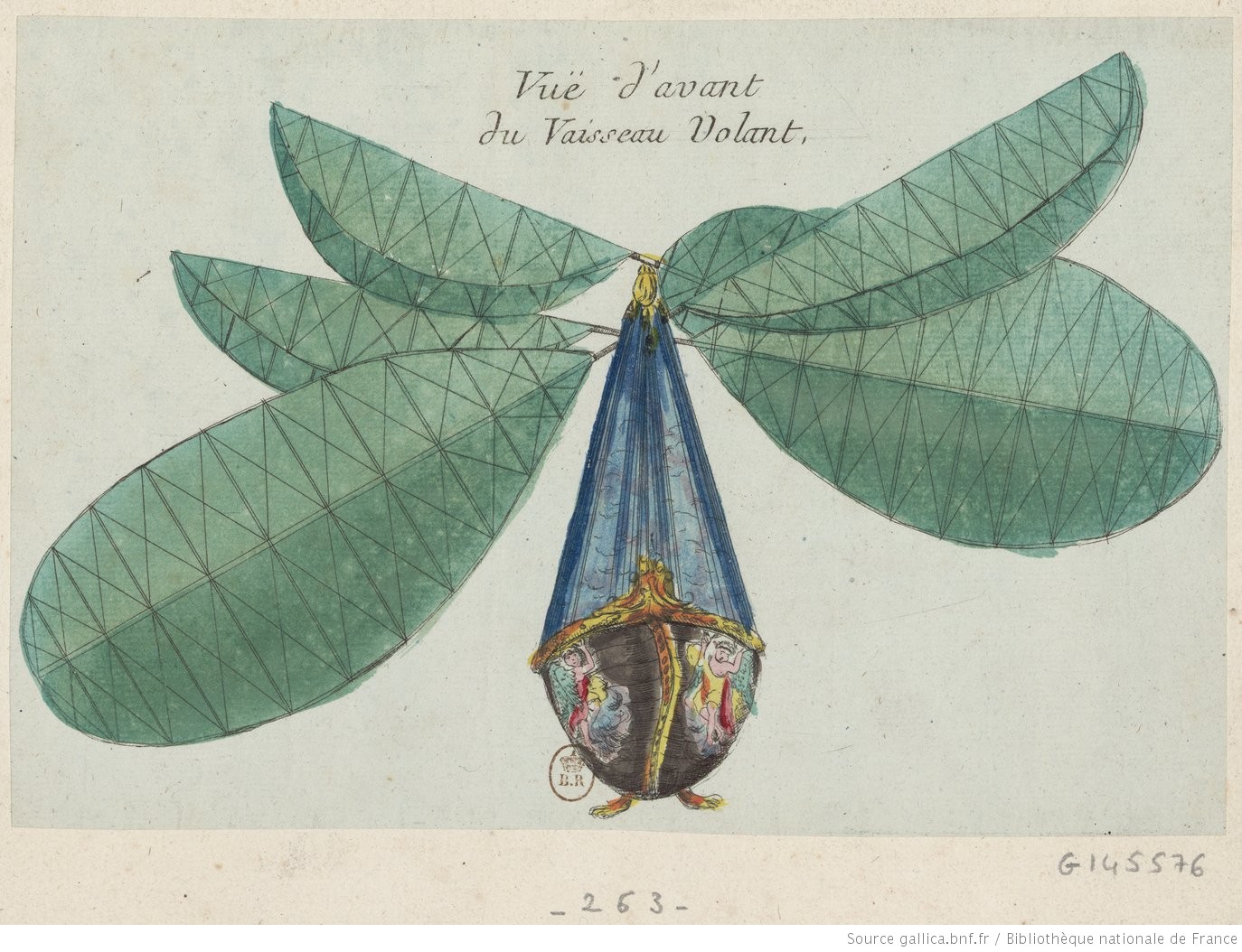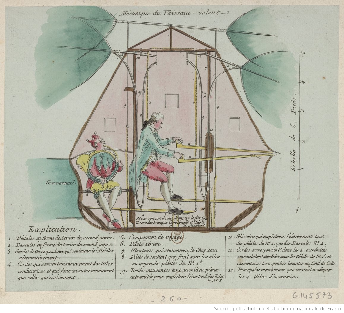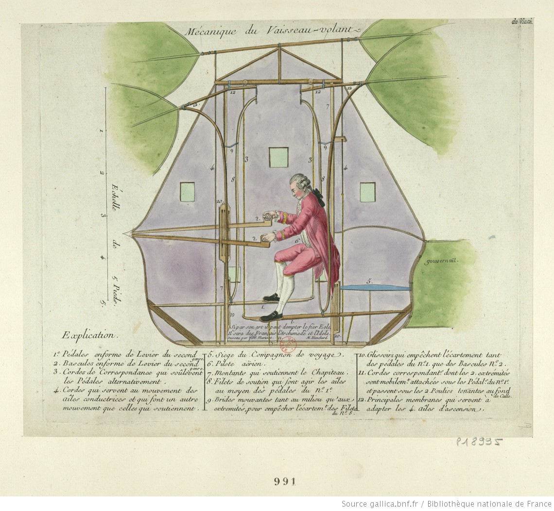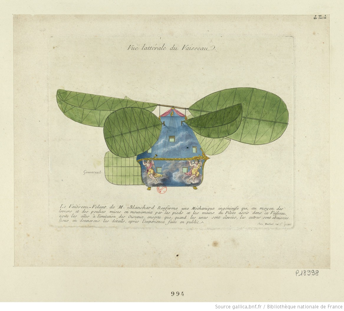 Le Vaisseau Volant de Mr Blanchard renferme une Méchanique ingénieuse,qui au moyen des leviers et des poulies mises en mouvement par les pieds et les mains du Pilote assis dans ce Vaisseau, agite les ailes à l’imitation des Oiseaux, en sorte que quand les unes sont élevées les autres sont abaissées, nous en donnerons les détails après l’expériance faite en public : [machine à ailes battantes mues par un seul homme et construite pour voler sans aucune aide extérieure] : [estampe] – 1784