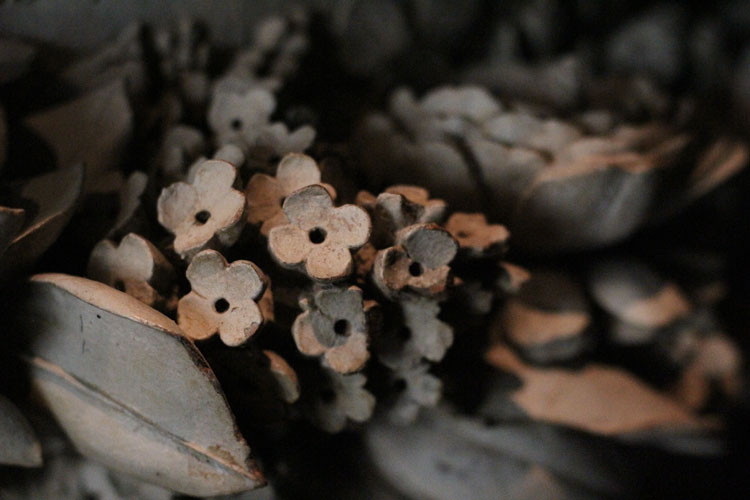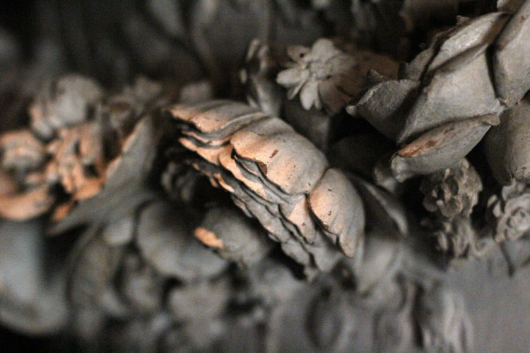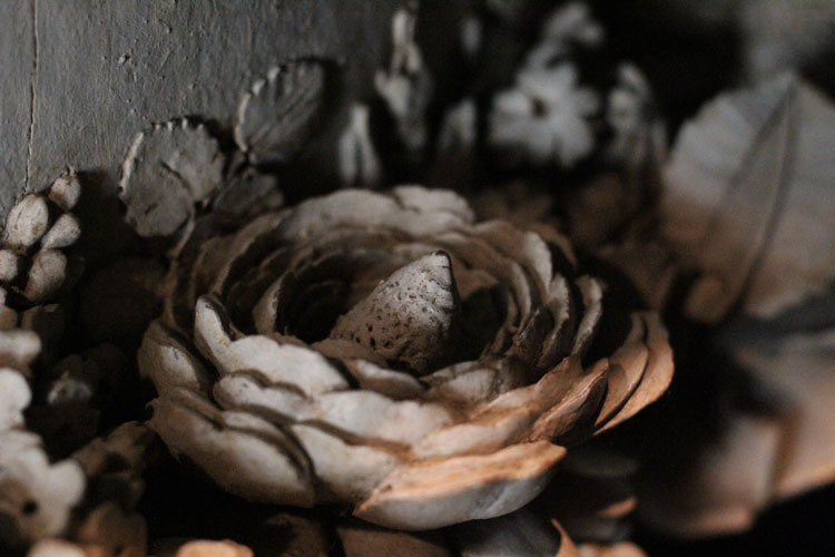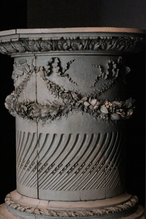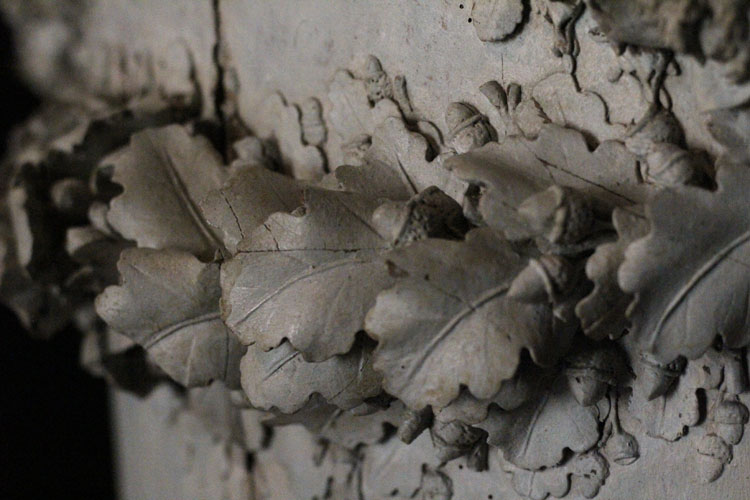 En forme de colonne antique tronquée, l’autel est entouré de guirlandes de fleurs, de feuilles de chêne et de glands maintenues par des rubans noués.