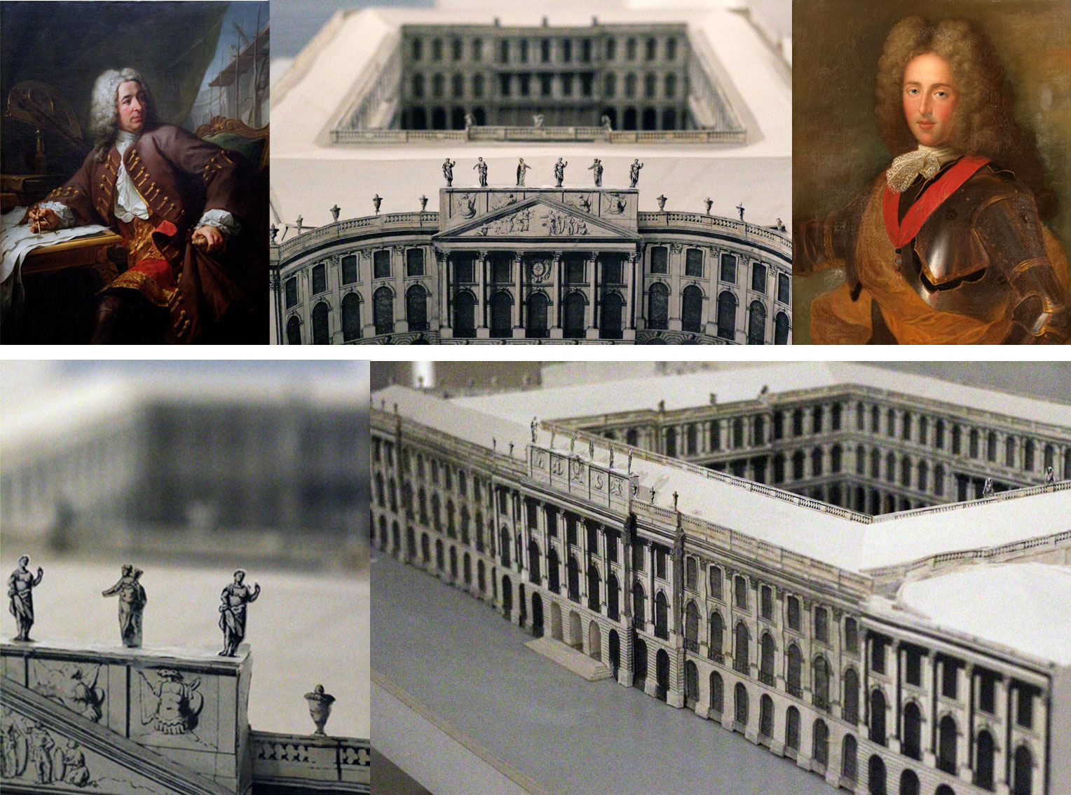 Nota bene : on retrouve en arrière plan du tableau de Jean Restout (musée des Beaux-arts de Nancy) la courbe exacte de la maquette du bâtiment exécutée d’après l’élévation originale de Germain Boffrand