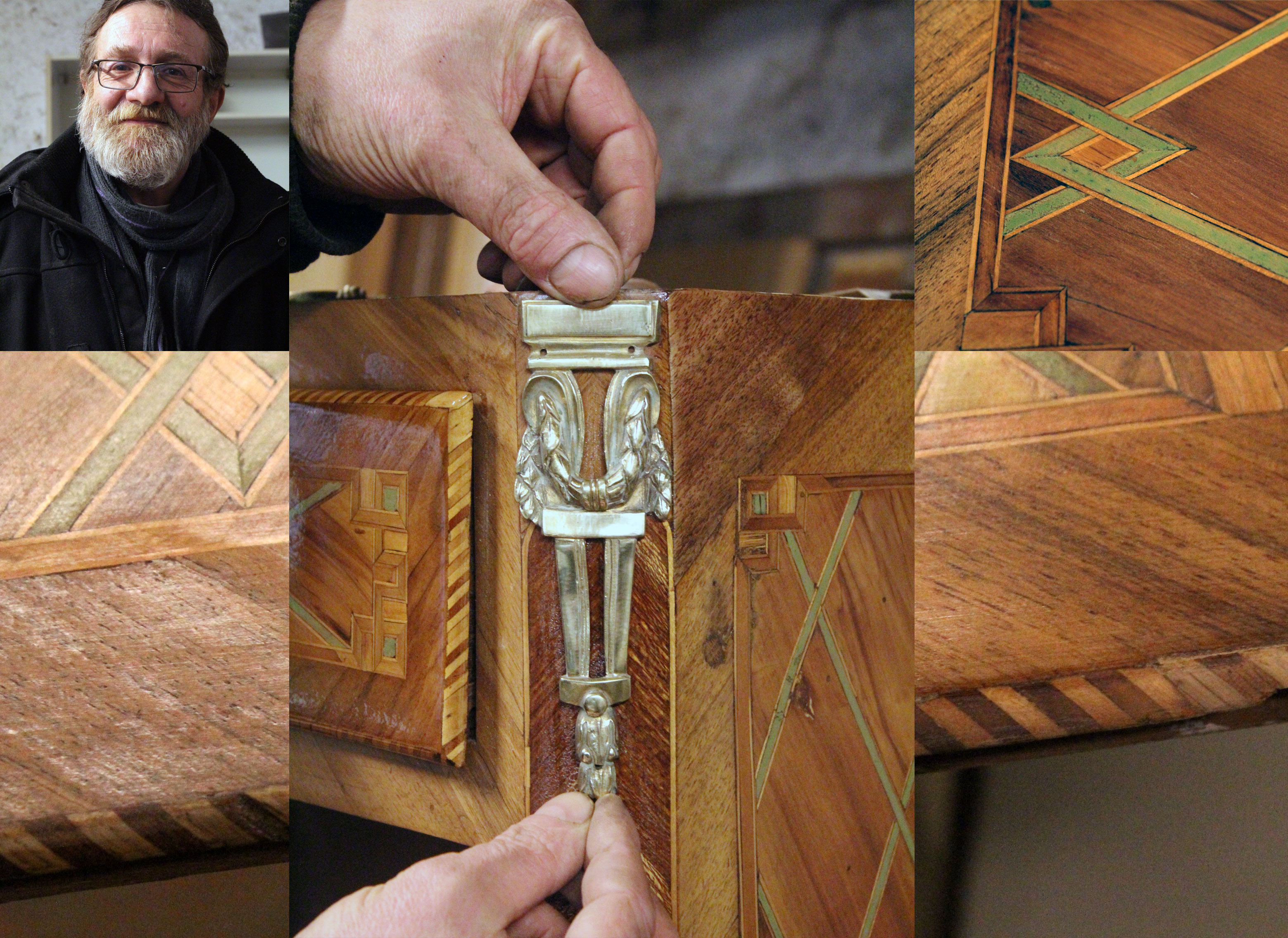 Les manques, dus au grand âge de cette pièce remarquable, sont replaqués à l’identique petit-à-petit et avec minutie, une véritable remise en beauté réalisée par Alain Christ, orfèvre du bois !