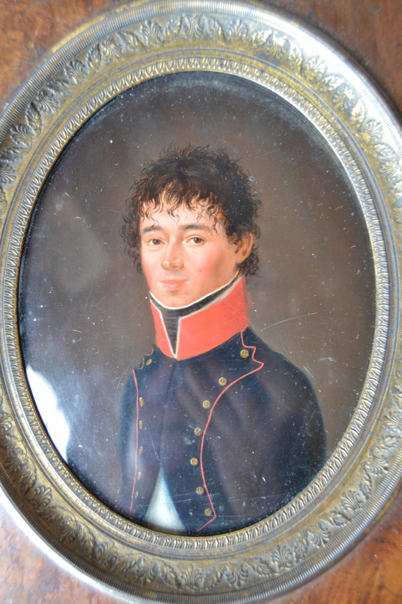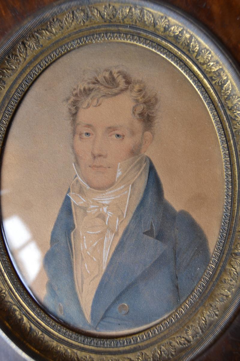Grande miniatures attribuées à jean baptiste ISABEY (1767-1855), une est une aquarelle représentant un portrait d’un jeune homme en buste, veste bleu et chemise blanche, et l’autre une huile sur panneau représentant le portrait d’un jeune homme en buste, en uniforme de chasseur à cheval .