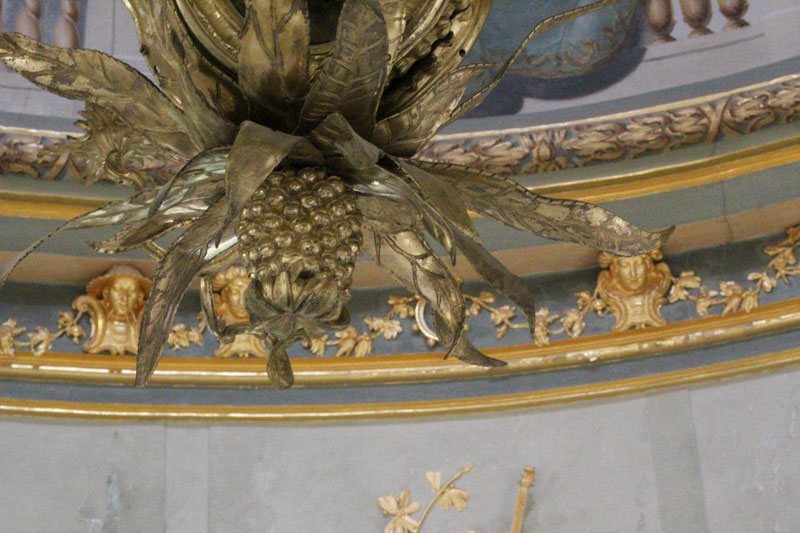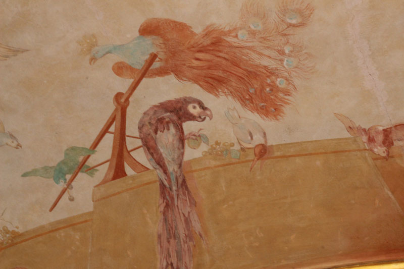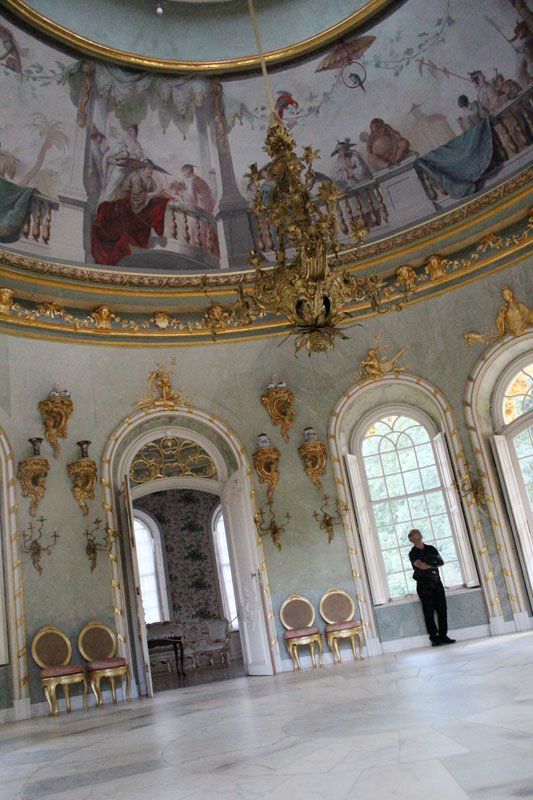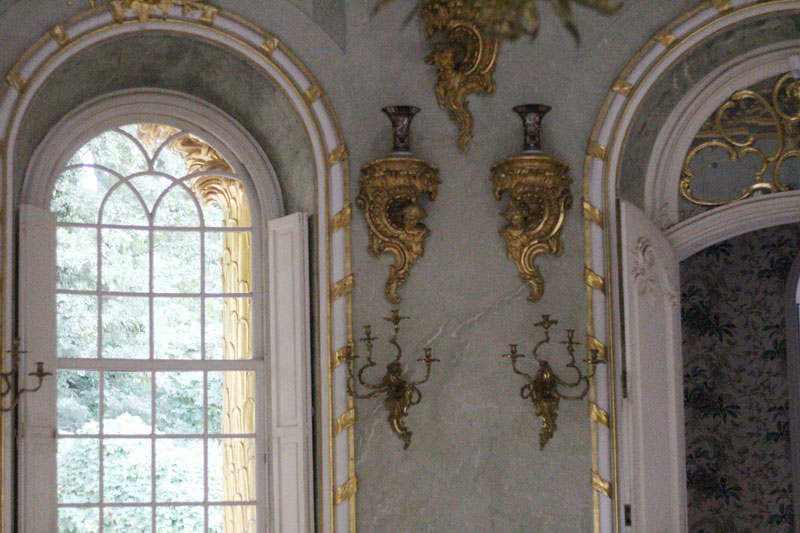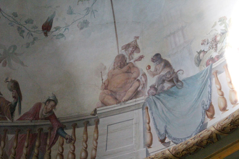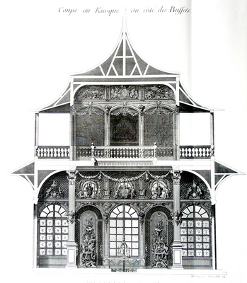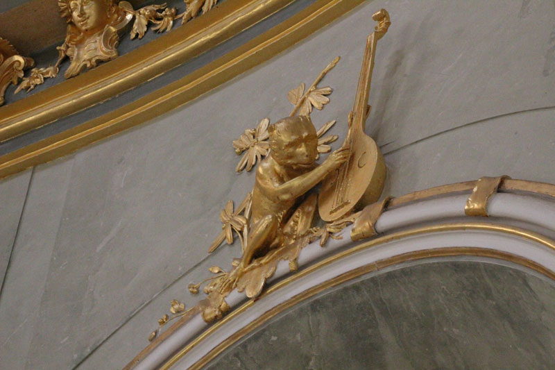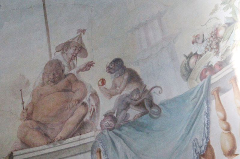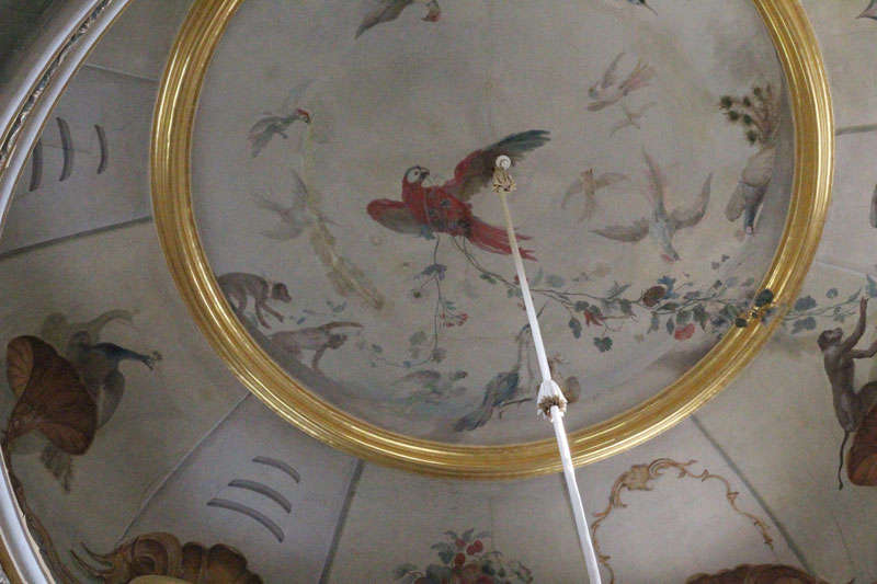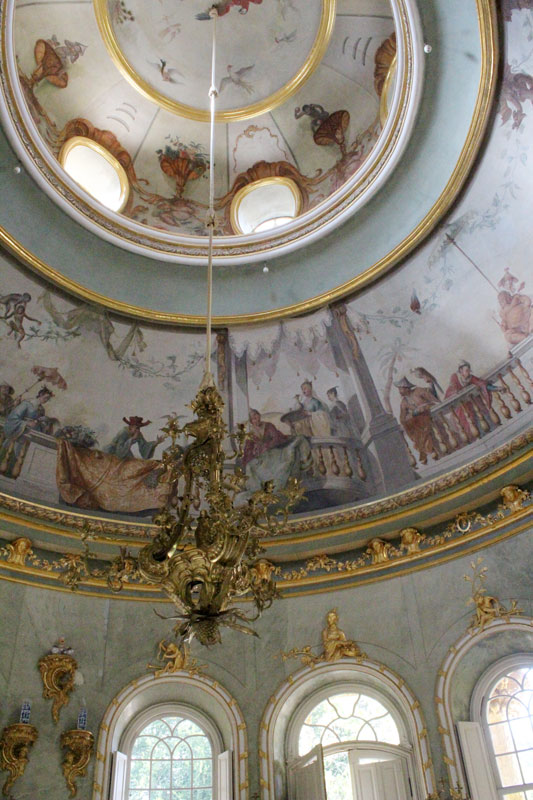 Cette réplique est commandée par le roi Frédéric II de Prusse, grand ami de Voltaire qui y fit représenter le malicieux philosophe sur la fresque intérieure, mais celui ci grimé en singe à lunettes !