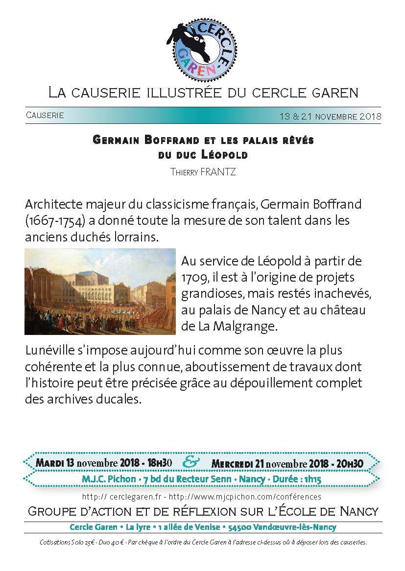 Conférence sur Germain Boffrand by Thierry Frantz Posté le 10 novembre 201821 novembre 2018by Pascale Debert “Boffrand et les palais rêvés du duc Léopold” Mardi 13 novembre, 18h30 et mercredi 21 novembre, 20h30 MJC Pichon