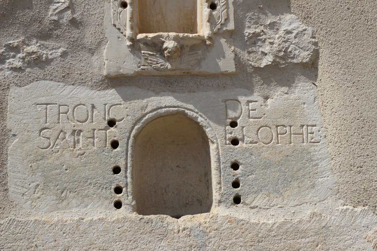 Enfin, un troisième miracle se produisit lorsque Élophe, toujours sa tête sous son bras, exténué (on le serait à moins), s’effondra sur une pierre pour rendre son âme à Dieu. La pierre se transforma miraculeusement en siège.