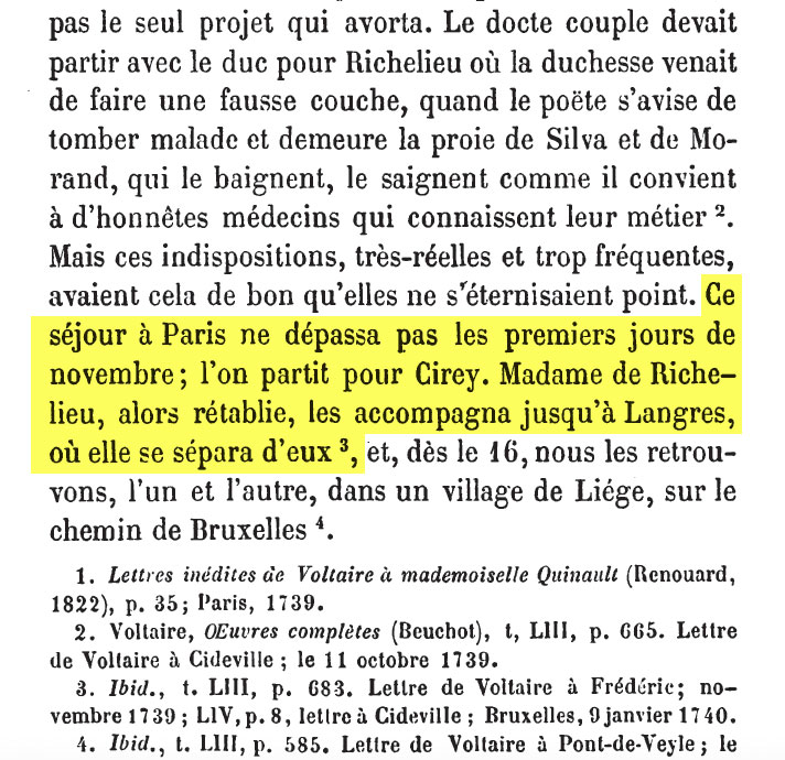 Début novembre 1739, Emilie et Voltaire partent pour Cirey, accompagnés de Mme de Richelieu, dont il se séparent à Langres !